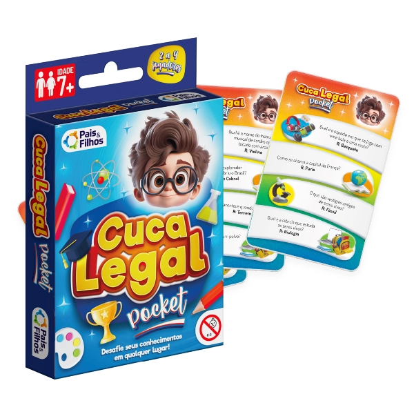 O Cuca Legal Pocket é um jogo de cartas educativo de perguntas e respostas, feito para testar conhecimentos de forma divertida entre amigos ou família. Ele é uma versão pequena do clássico Cuca Legal, fácil de levar para viagens, escola ou passeios.