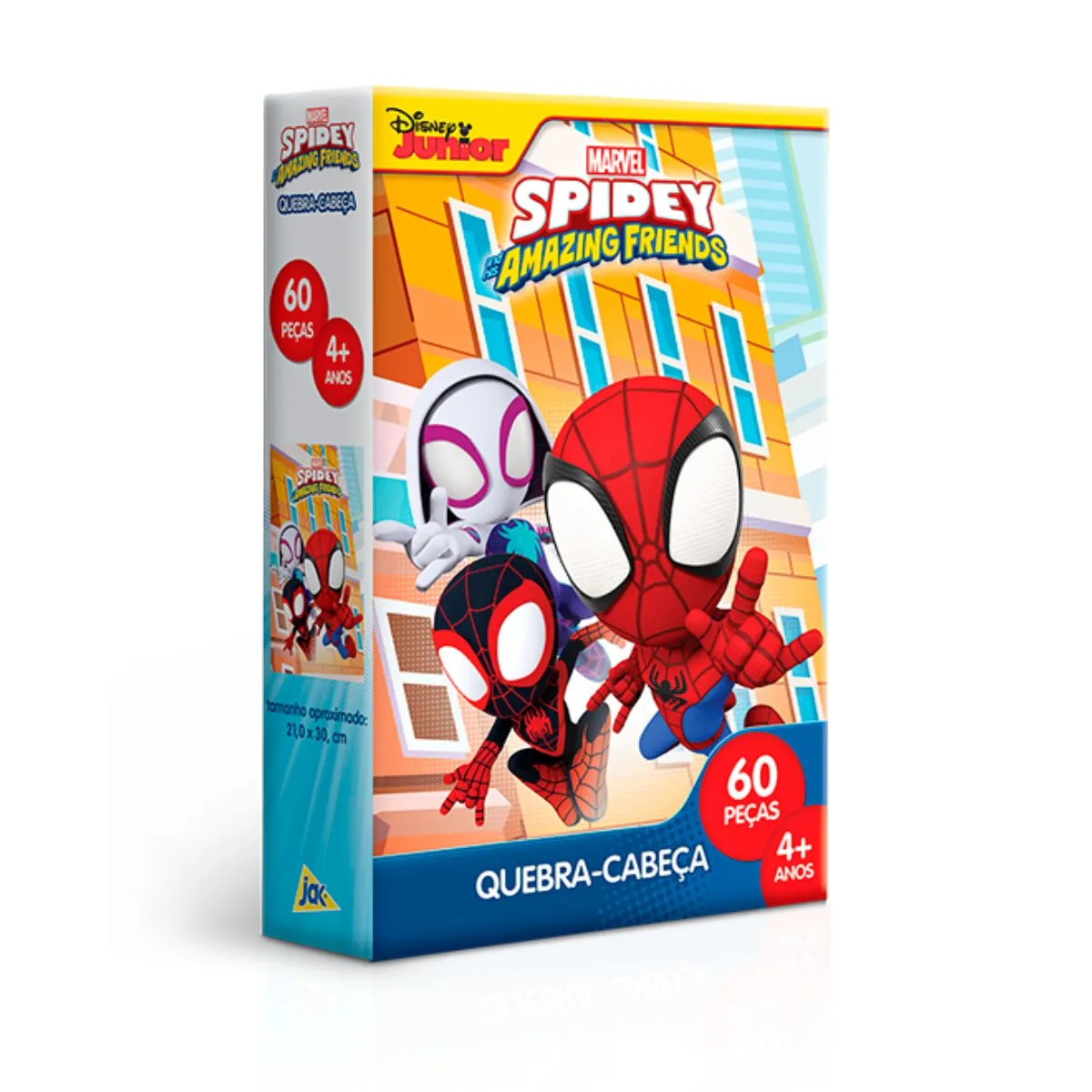 O quebra-cabeça do Spidey and His Amazing Friends é um brinquedo infantil inspirado na série da Marvel voltada para crianças pequenas. Ele traz os personagens Spidey, Miles Morales (Spin) e Ghost-Spider em uma imagem colorida e fácil de montar.
