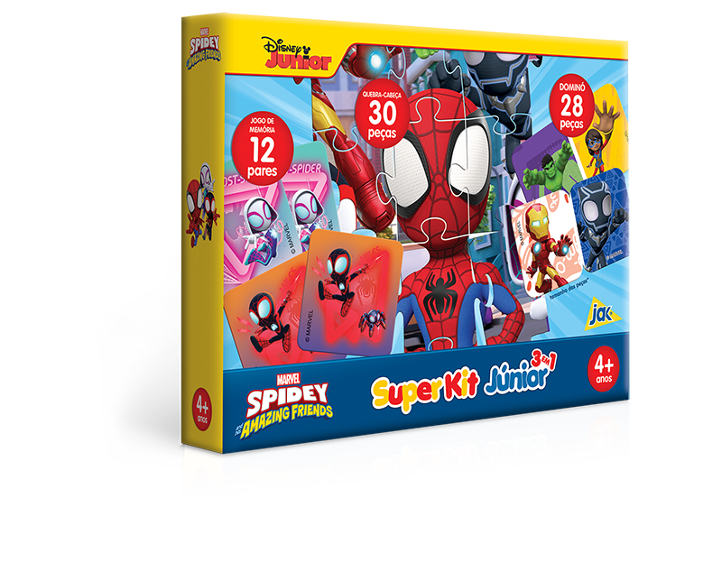 Divertido kit com quebra-cabeça 30 peças, jogo de memória com 12 pares e dominó com 28 peças do Spidey e seus amigos!